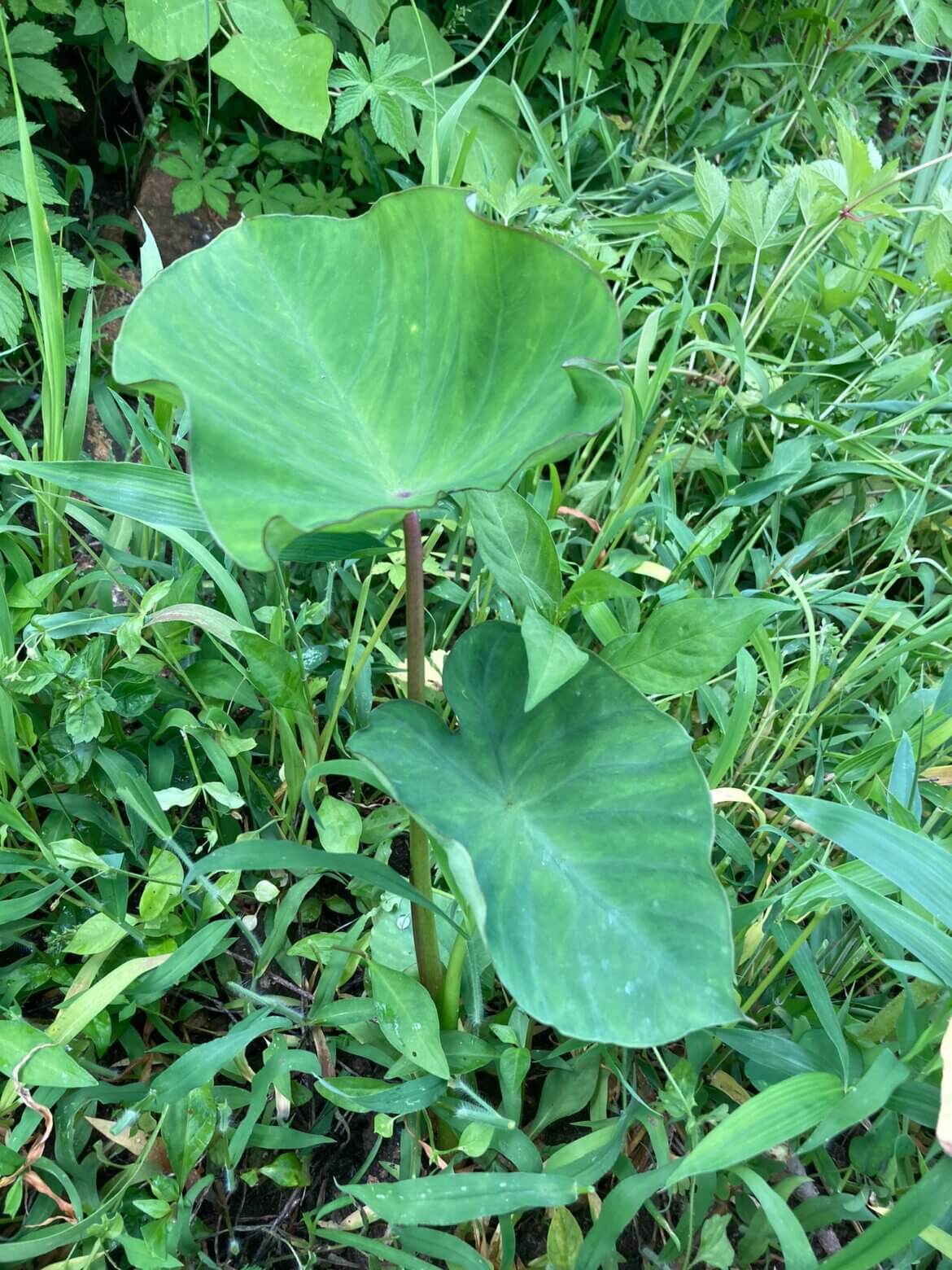 里芋が出てた!(これも自然栽培の里芋をもらってそのまま植えてたんだけど、水やりせず、ちゃんと芽が出たどころか、大きくなってて感動!)