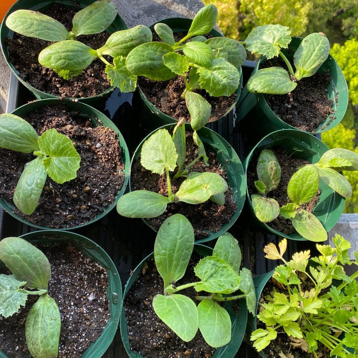 4/17 ベランダ育苗:ズッキーニ、きゅうり、トマト、ミニトマト、バジル