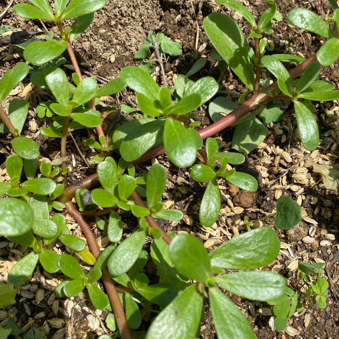 6月後半になって、畝の上に多肉植物みたいなのが生えてきた。なんかかわいいので、刈らずに置いてたんだけど、どうやら、これは、スベリヒユ、らしい。